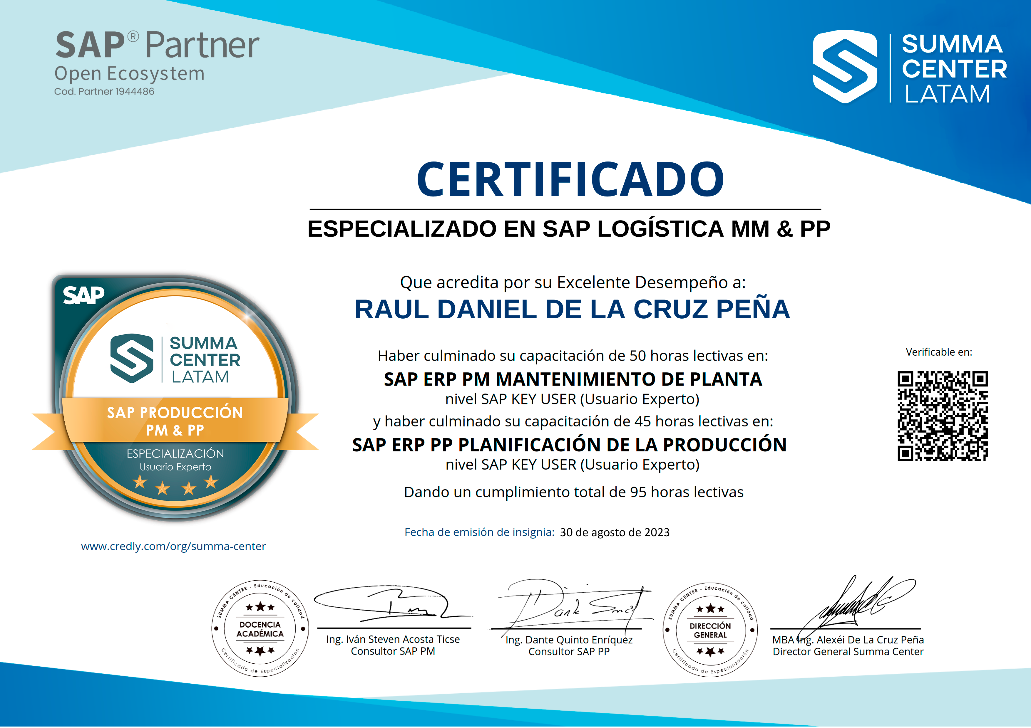 Ingeniero Industrial de la Universidad Tecnológica del Perú e Ingeniero Físico de la Universidad Nacional de Ingeniería, Perú. Es consultor SAP PP/MM con experiencia en implementación SAP PP/MM: SFC, PI, SOP, DRP, MPS, MRP, LO-VC y conocimientos de procesos comerciales, planificación, producción, distribución y customizing SAP PP/MM.