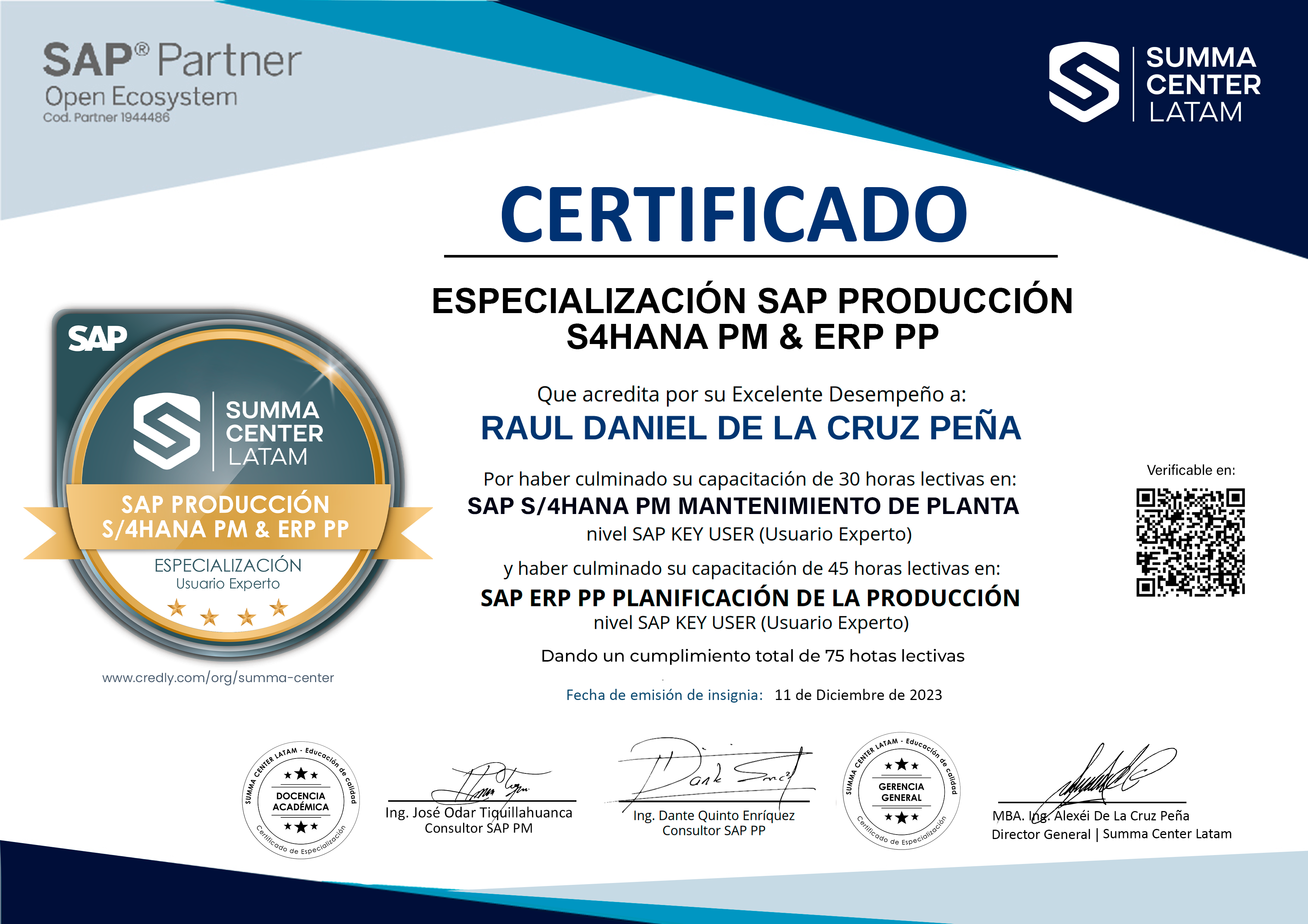 Ingeniero de Sistemas e Informática y consultor certificado en los módulos SAP PM y SAP PP de S/4HANA con más de 6 años como planeador de mantenimiento, datos maestros, mantenimiento evolutivo, correctivo y preventivo del módulo SAP PM.