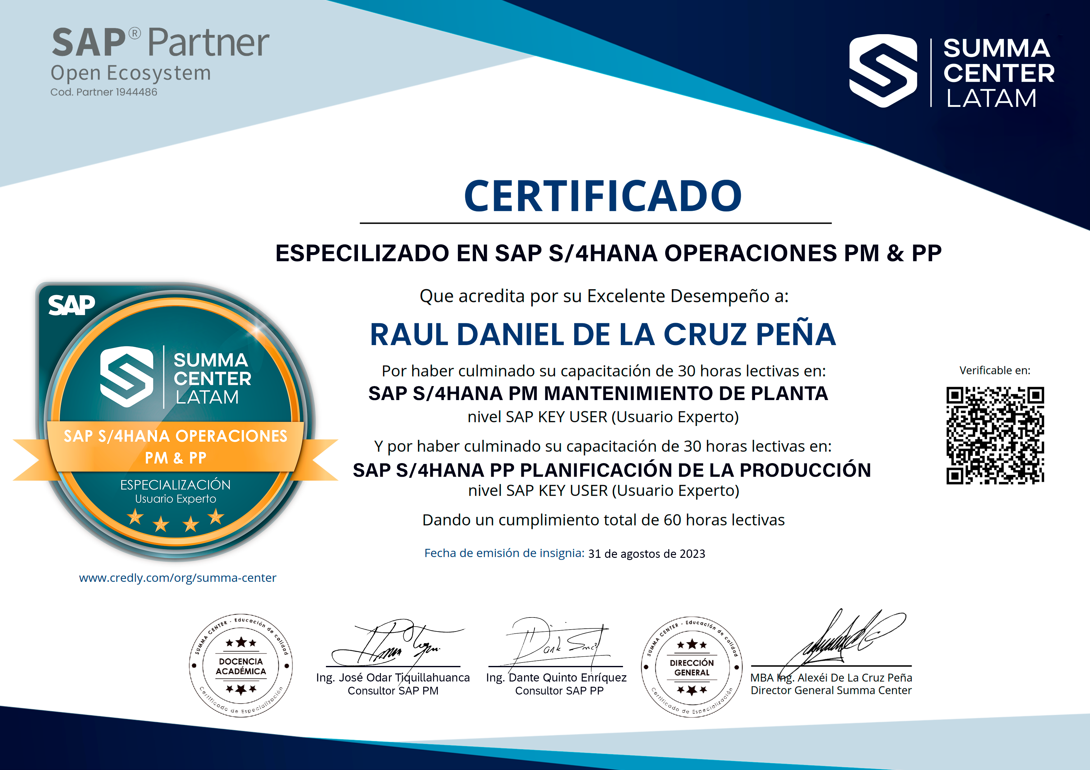 Ingeniero Industrial de la Universidad Tecnológica del Perú e Ingeniero Físico de la Universidad Nacional de Ingeniería, Perú. Es consultor SAP PP/MM con experiencia en implementación SAP PP/MM: SFC, PI, SOP, DRP, MPS, MRP, LO-VC y conocimientos de procesos comerciales, planificación, producción, distribución y customizing SAP PP/MM.
