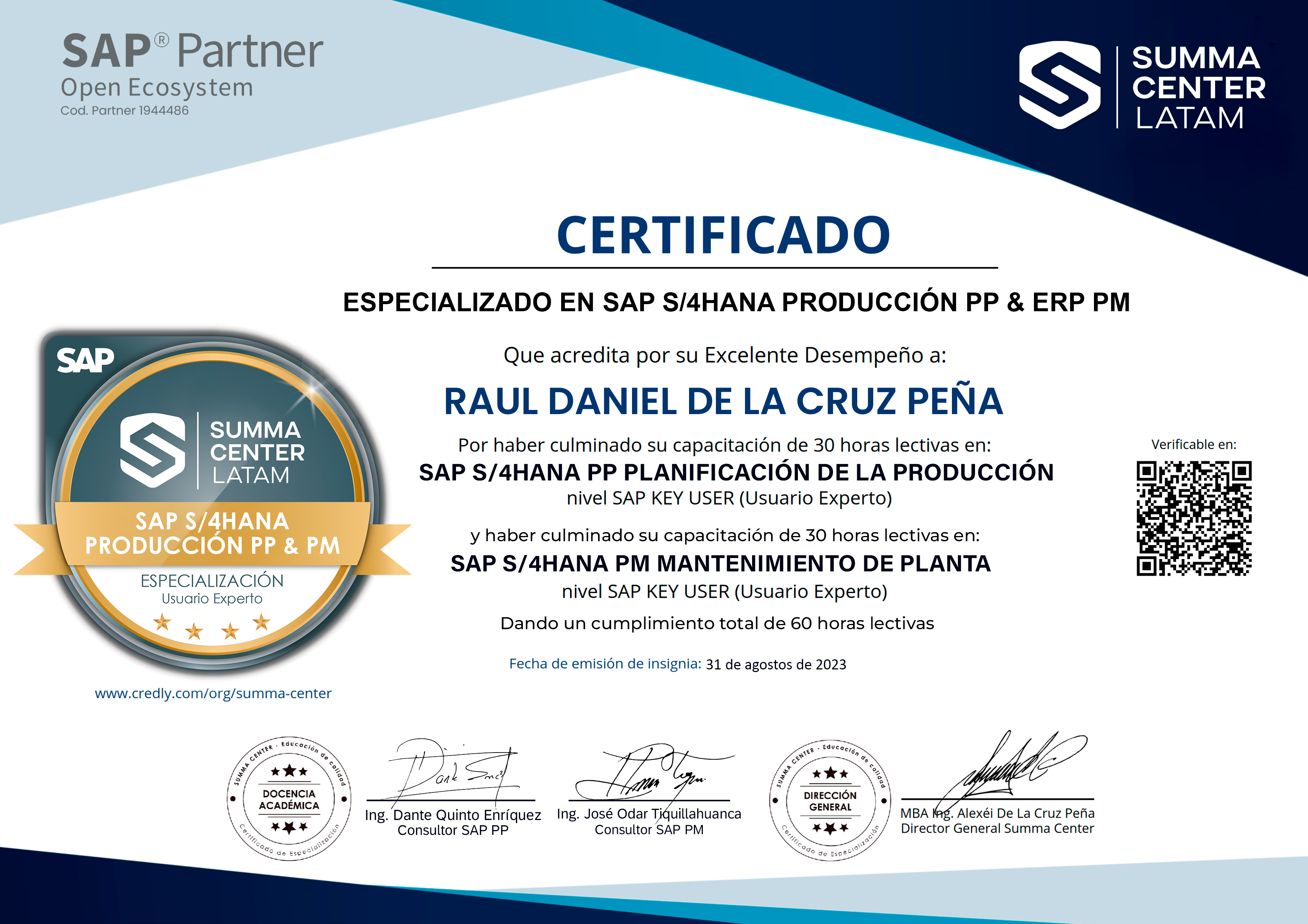 Ingeniero Industrial de la Universidad Tecnológica del Perú e Ingeniero Físico de la Universidad Nacional de Ingeniería, Perú. Es consultor SAP PP/MM con experiencia en implementación SAP PP/MM: SFC, PI, SOP, DRP, MPS, MRP, LO-VC y conocimientos de procesos comerciales, planificación, producción, distribución y customizing SAP PP/MM.