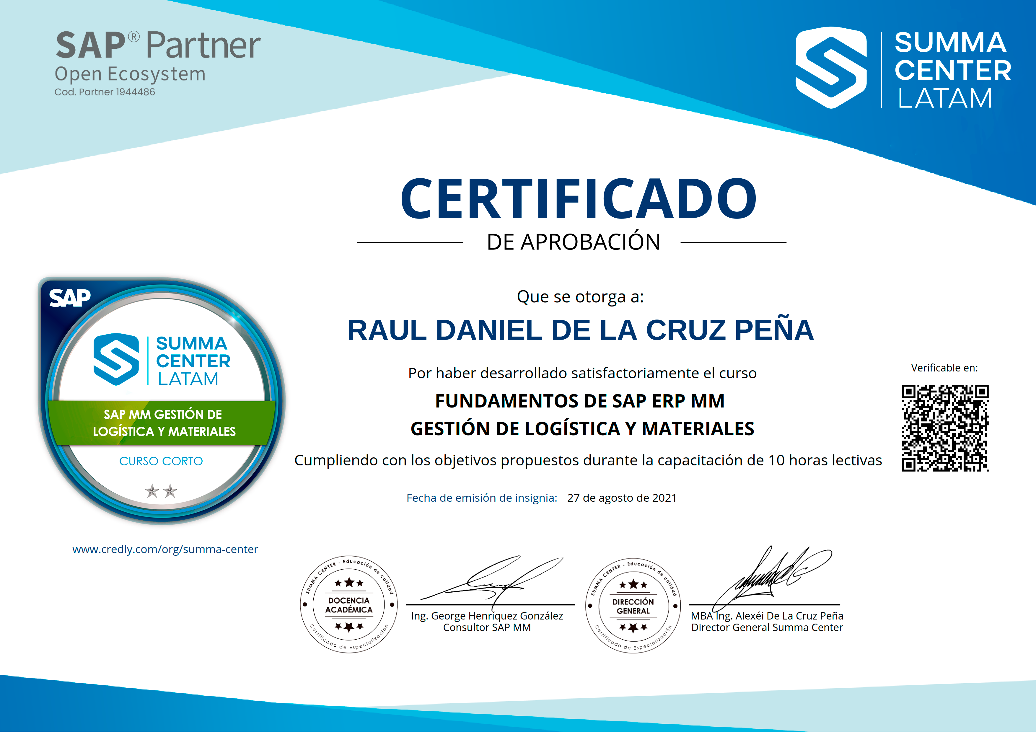 Ingeniero Industrial y consultor certificado en SAP S/4 HANA MM. Actualmente labora para Everis Perú como consultor SAP MM y ha participado en diversos proyectos SAP como el proyecto de implementación Alicorp Bolivia. Asimismo, posee experiencia en manejo de integración con los módulos FI, SD, PP y PM.