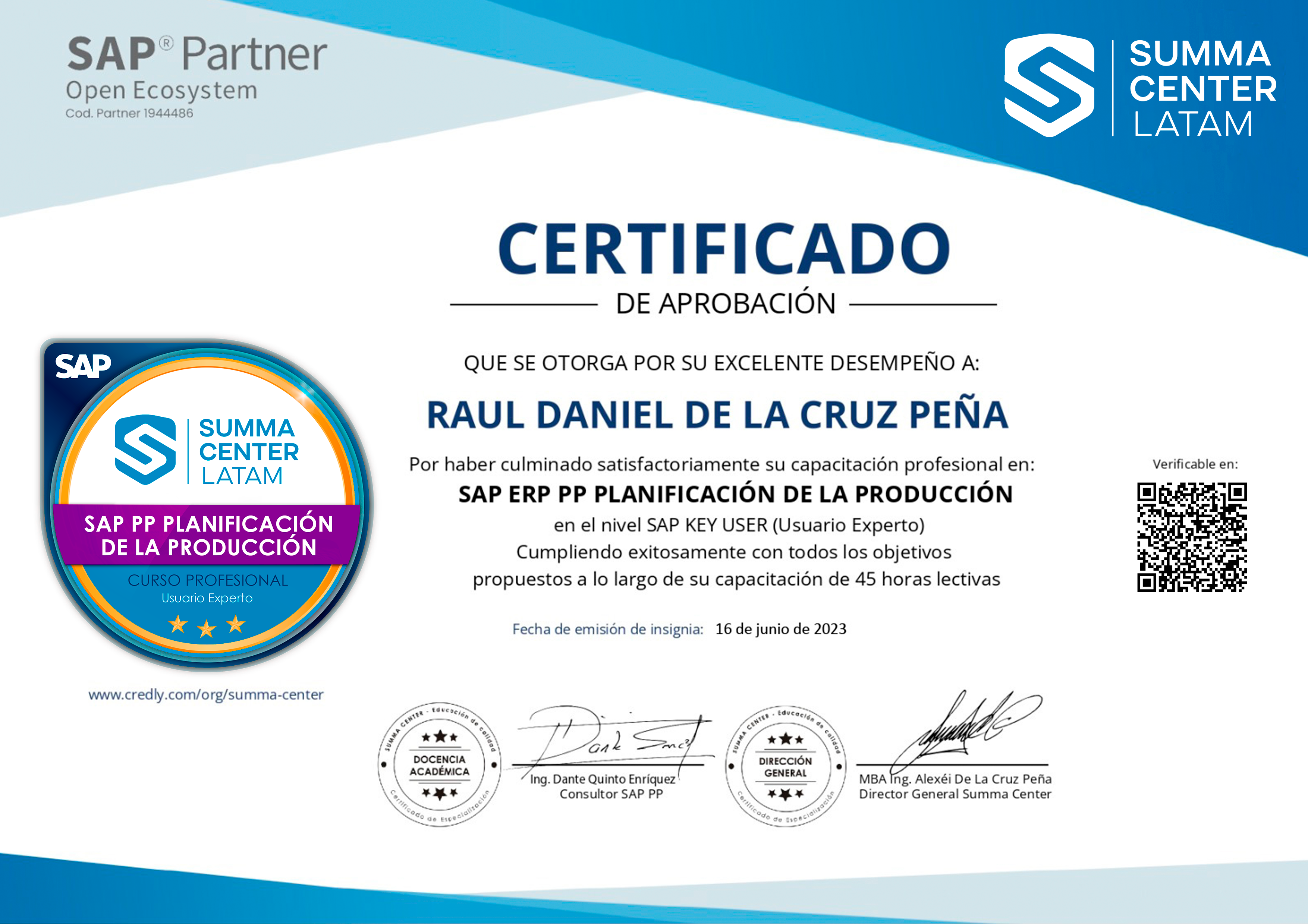 Ingeniero Industrial de la Universidad Tecnológica del Perú e Ingeniero Físico de la Universidad Nacional de Ingeniería, Perú. Es consultor SAP PP/MM con experiencia en implementación SAP PP/MM: SFC, PI, SOP, DRP, MPS, MRP, LO-VC y conocimientos de procesos comerciales, planificación, producción, distribución y customizing SAP PP/MM.