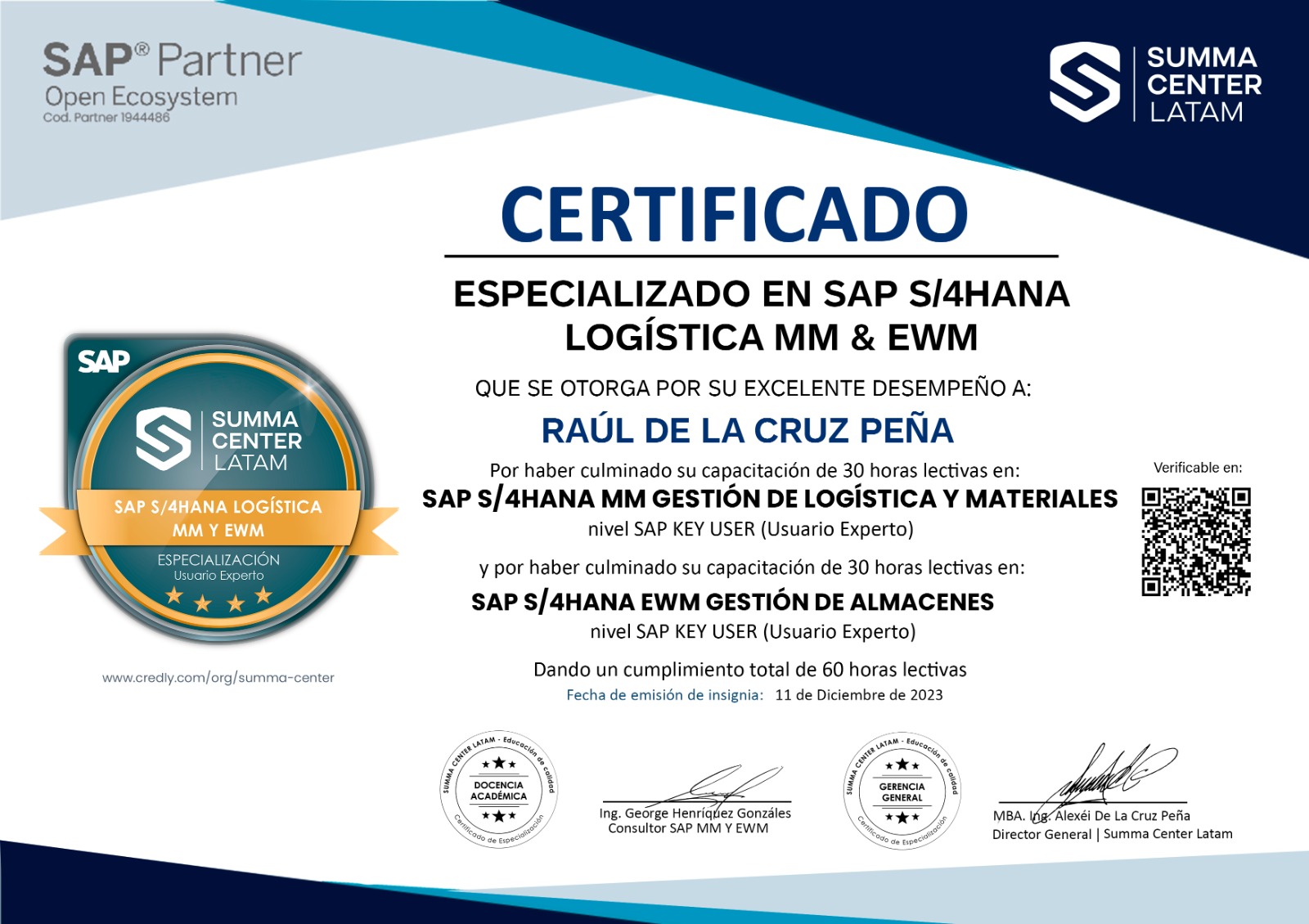Ingeniero Industrial y consultor certificado en SAP S/4 HANA MM. Actualmente labora para Everis Perú como consultor SAP MM y ha participado en diversos proyectos SAP como el proyecto de implementación Alicorp Bolivia. Asimismo, posee experiencia en manejo de integración con los módulos FI, SD, PP y PM.