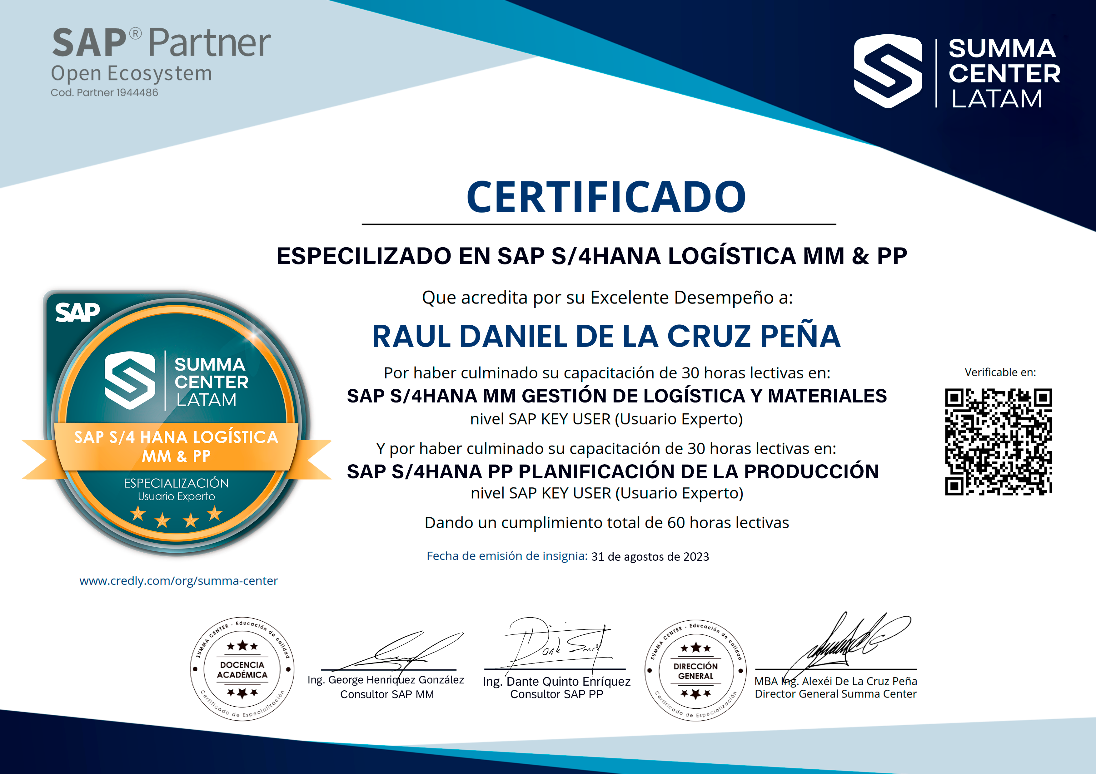 Ingeniero Industrial y consultor certificado en SAP S/4 HANA MM. Actualmente labora para Everis Perú como consultor SAP MM y ha participado en diversos proyectos SAP como el proyecto de implementación Alicorp Bolivia. Asimismo, posee experiencia en manejo de integración con los módulos FI, SD, PP y PM.