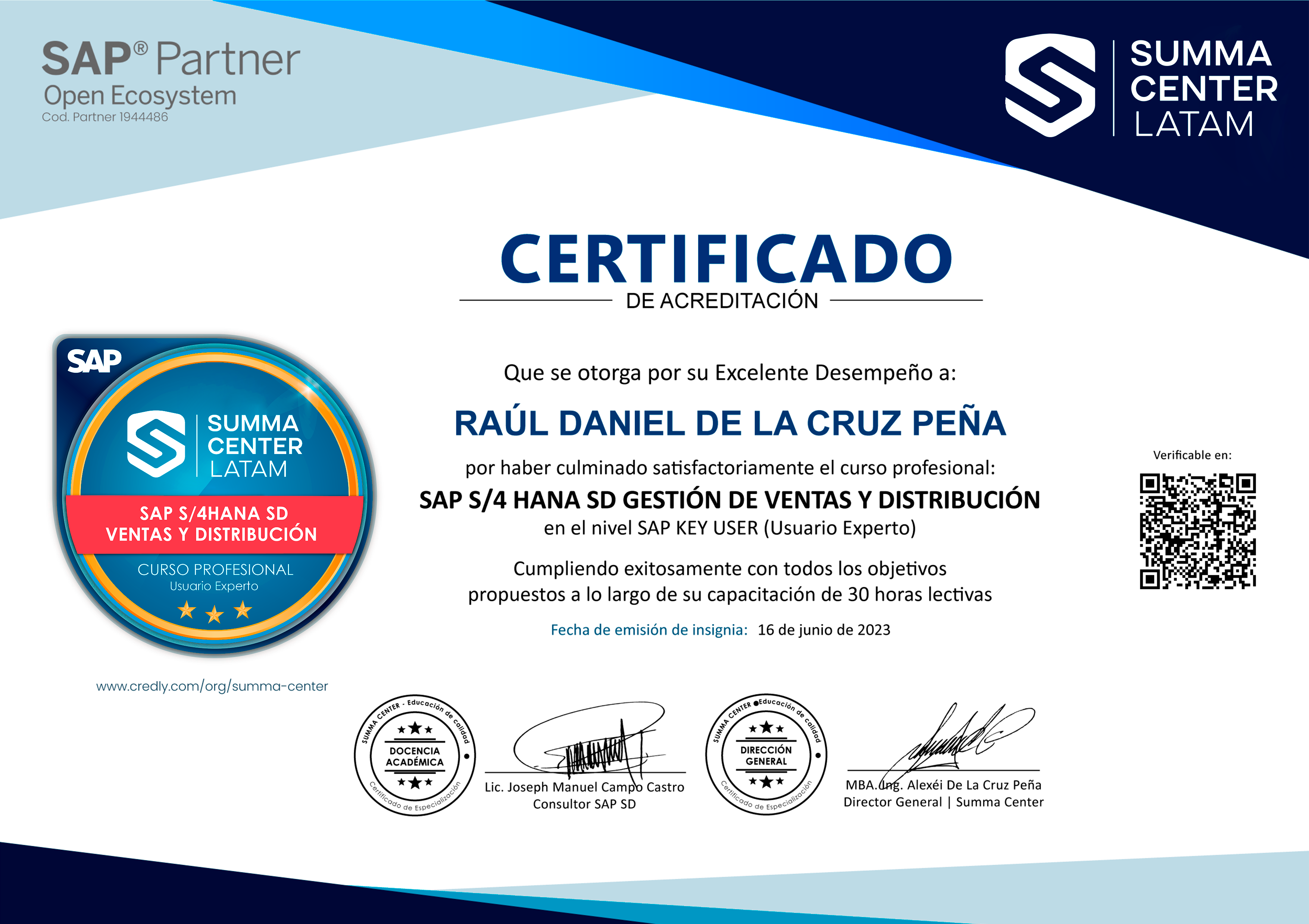 Licenciado en Gestión Comercial y consultor certificado en SAP S4 HANA SD (Sales and Distribution) y SAP S4 HANA TM (Transportation Management) con amplia experiencia implementando SAP OTC gestión de ventas, cobranza, aplicabilidad y diseño de soluciones para la dinámica del mercado comercial y logístico.